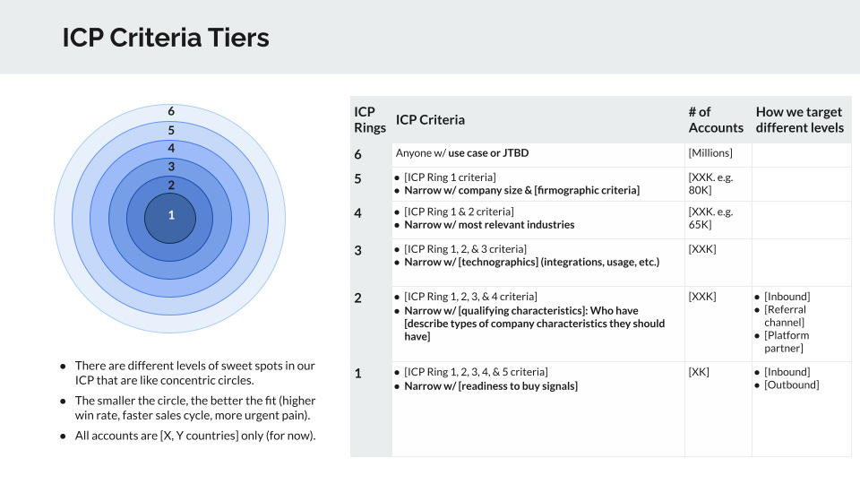 The beauty of this tool is that it forces alignment across your team. Everyone, from sales to marketing to product, can visualize and understand the different levels of your ICP sweet spot and how you plan to target (or not) each tier. This shared understanding reduces friction, improves communication, and ensures your GTM efforts hit the bullseye––not just the general vicinity.