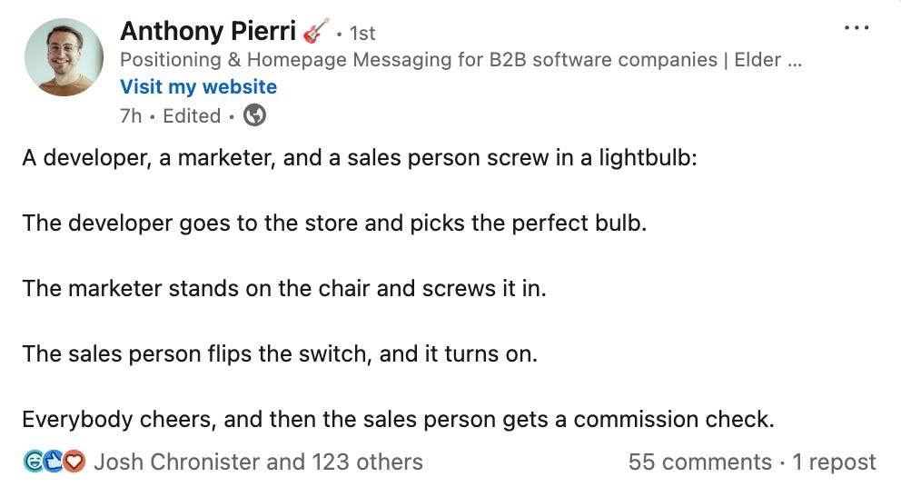 This joke nails the dynamic in most B2B companies: everyone contributes, but sales gets the revenue credit.
